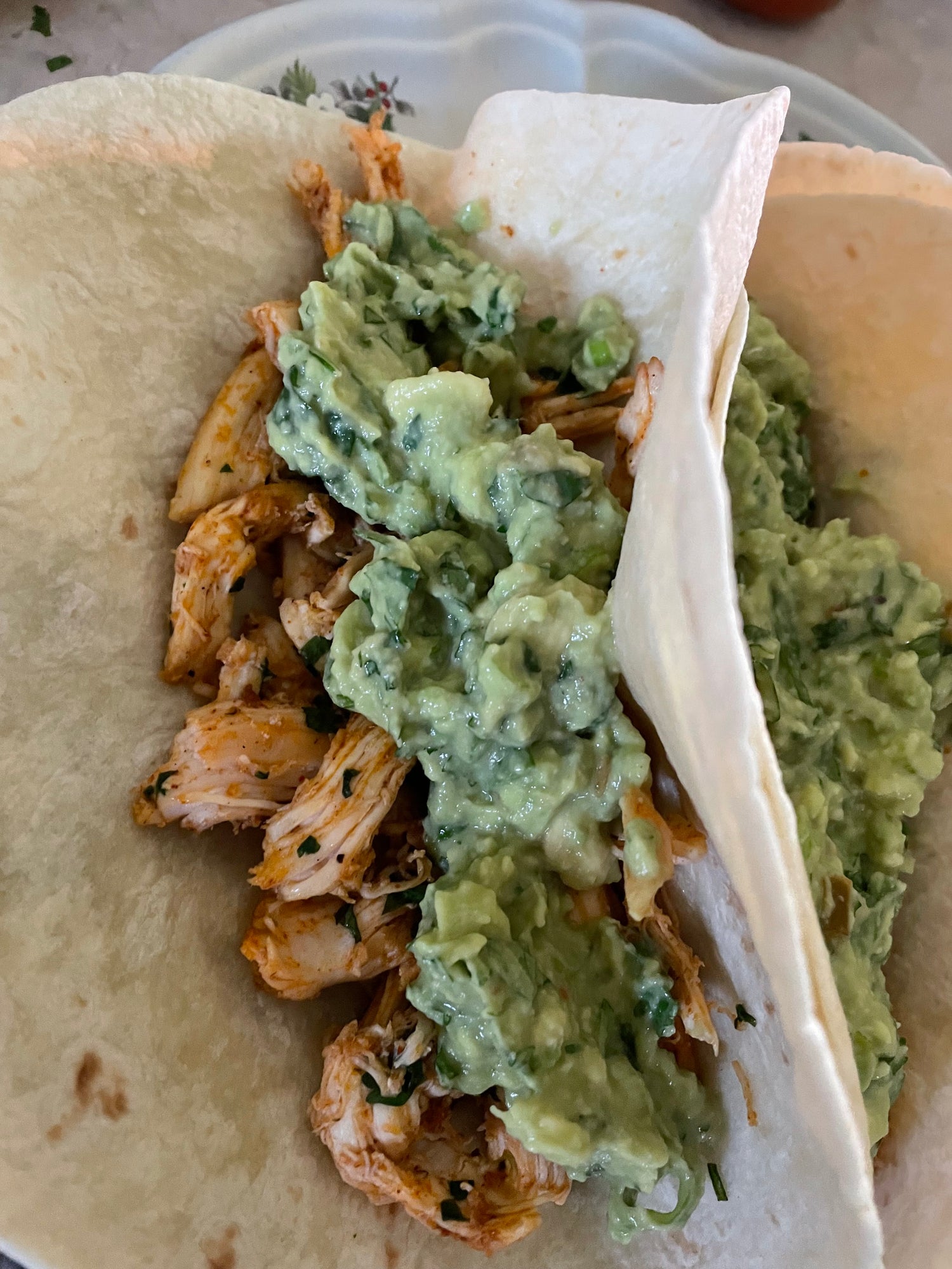 Spoon chicken into a warmed tortilla, top with fresh guacamole, and ENJOY!