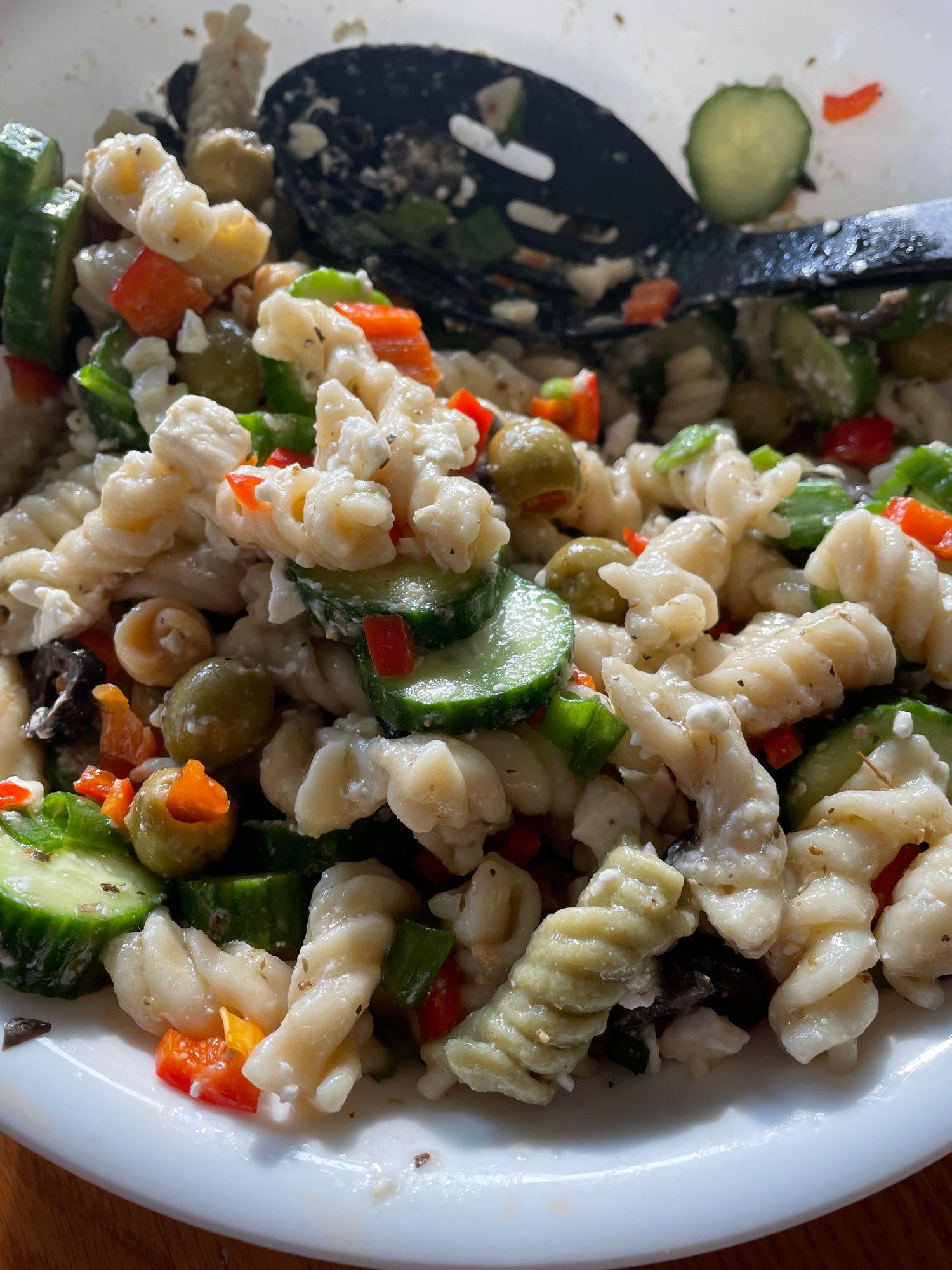 Are you a busy family? Practices, Chores, Games and the like? Are veggies going bad in the bin? This pasta salad saves the day!